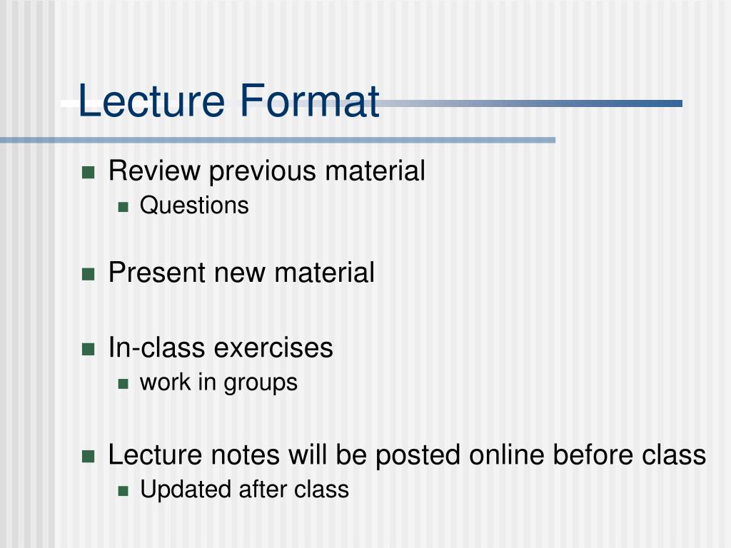 Lecture Format • Review previous material • Questions • Present new material • In-class exercises • work in groups • Lecture notes will be posted online before class • Updated after class