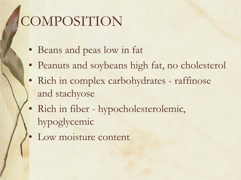COMPOSITION • Beans and peas low in fat • Peanuts and soybeans high fat, no cholesterol • Rich in complex carbohydrates - raffinose and stachyose • Rich in fiber - hypocholesterolemic, hypoglycemic • Low moisture content