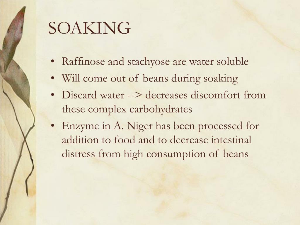 SOAKING • Raffinose and stachyose are water soluble • Will come out of beans during soaking • Discard water --> decreases discomfort from these complex carbohydrates • Enzyme in A. Niger has been processed for addition to food and to decrease intestinal distress from high consumption of beans