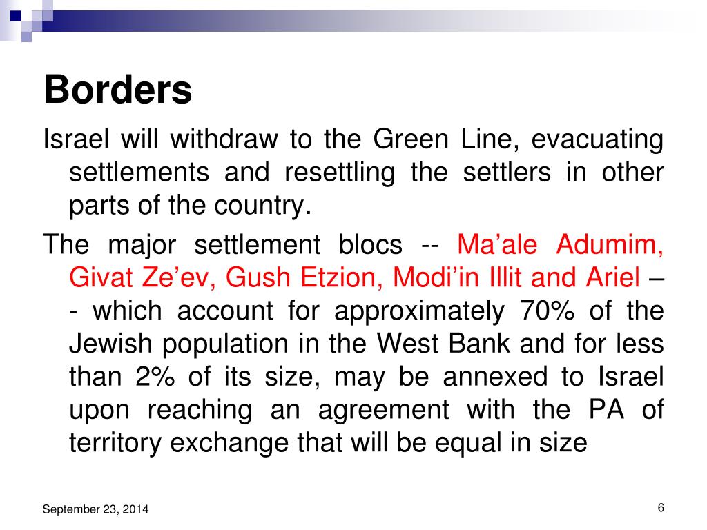 Borders Israel will withdraw to the Green Line, evacuating settlements and resettling the settlers in other parts of the country. The major settlement blocs -- Ma’ale Adumim, Givat Ze’ev, Gush Etzion, Modi’in Illit and Ariel –- which account for approximately 70% of the Jewish population in the West Bank and for less than 2% of its size, may be annexed to Israel upon reaching an agreement with the PA of territory exchange that will be equal in size