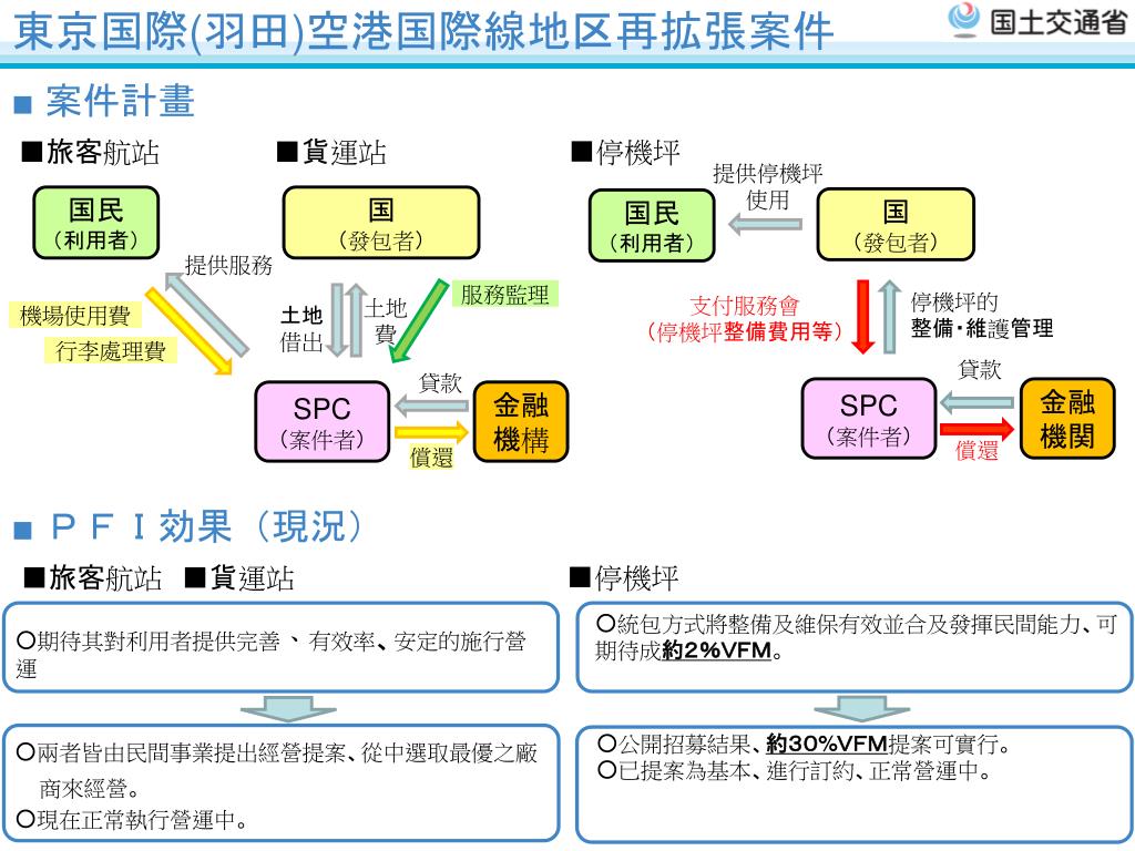国土交通省PFI案件案例(2) 東京国際(羽田)空港國際線地区再拡張案件 案件概要 進度狀況(含預定) 提案時願景圖 平成17年 4月 實施方案公佈 平成18年 3月 案件定約(停機坪) 平成18年 7月 案件定約(旅客・貨物) 平成19年 3月 停機坪案件開工 平成20年 5月 旅客航站案件開工 平成21年 2月 貨運站事業開工 平成22年10月 停機坪預定提供使用 平成22年10月 旅客航站預定提供使用 平成22年10月 貨運站預定提供使用 平成47年 3月 停機坪案件終止 平成50年 4月 旅客航站案件終止 平成51年 1月 貨運站案件終止