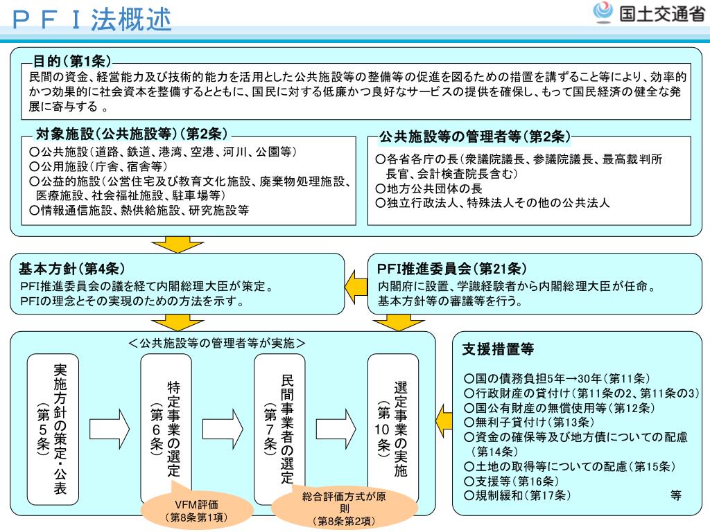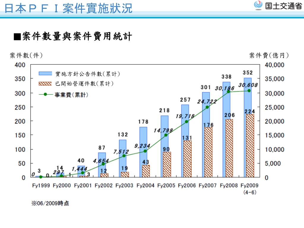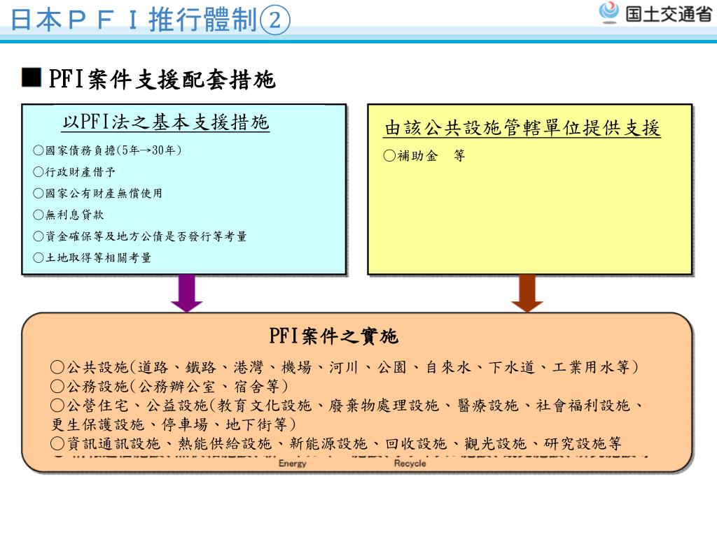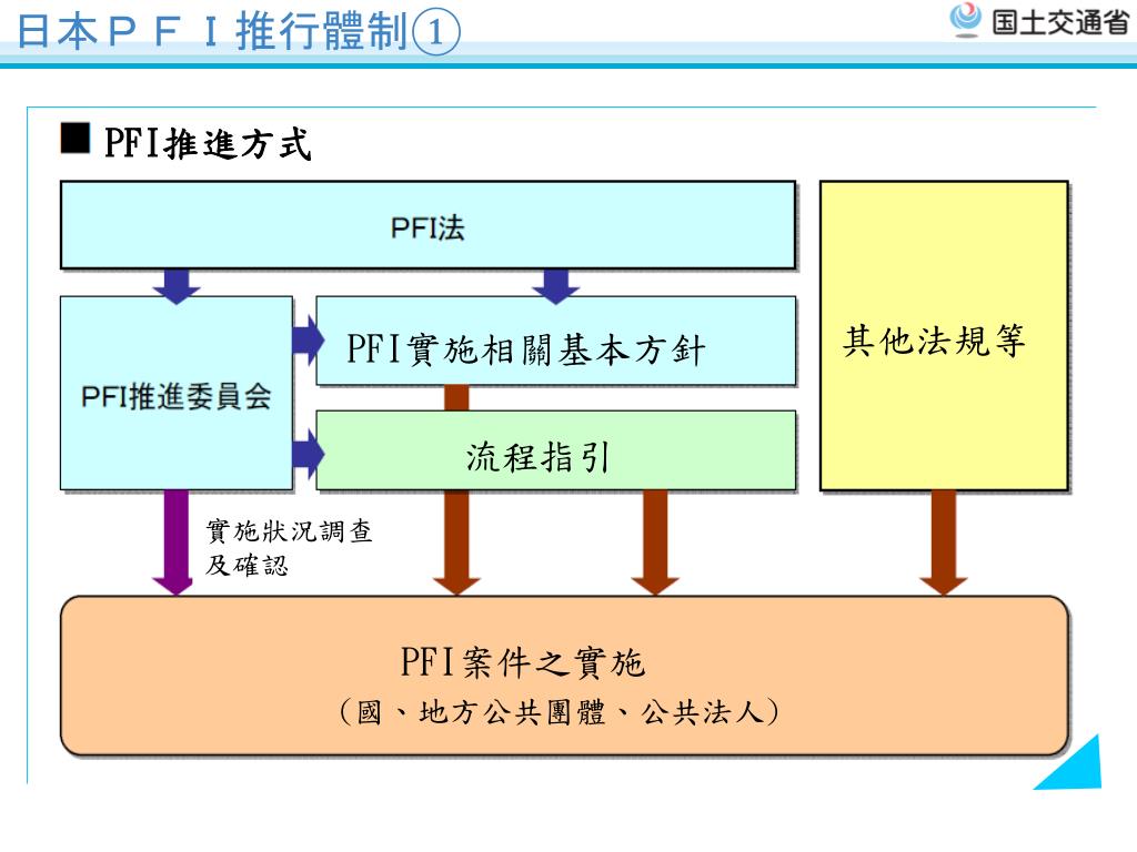 有關 日本PFI制度 及 国土交通省 之運用方式. 第1回日台建設交流会議 2 5 /2/2010. 日本PFI 歷程. 07/1999 「PFI法」施行 Enactment of “PFI Law” 10/1999 「PFI推進委員会」 運作 (PFI法第21条) Creation of “The Committee for Promotion of PFI” 03/2000 「 有關 PFI 案件 実施 之 基本方針」 訂定 (PFI法第4条)