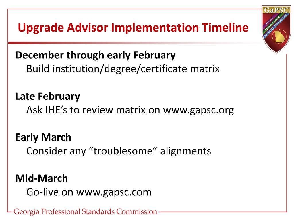 Upgrade Advisor Implementation Timeline December through early February Build institution/degree/certificate matrix Late February Ask IHE’s to review matrix on www.gapsc.org Early March Consider any “troublesome” alignments Mid-March Go-live on www.gapsc.com