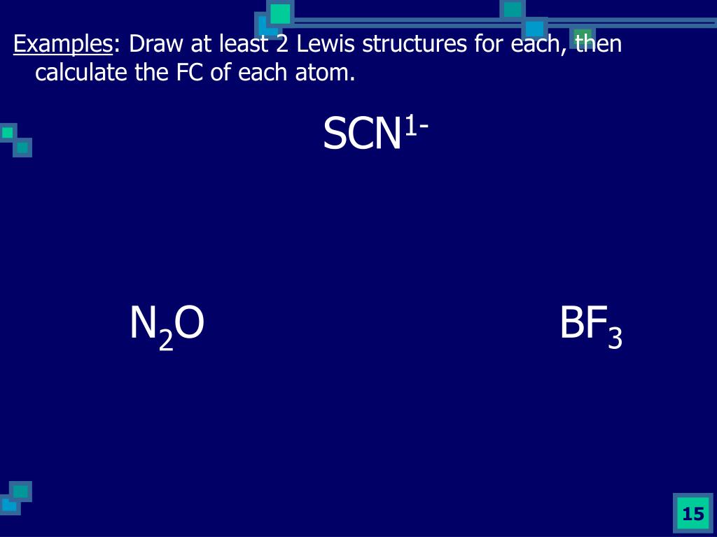 Examples: Draw at least 2 Lewis structures for each, then calculate the FC of each atom. SCN1- N2O BF3