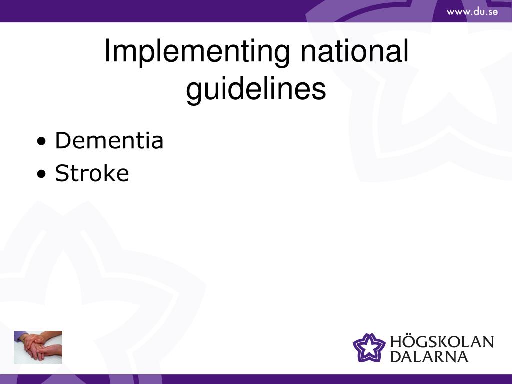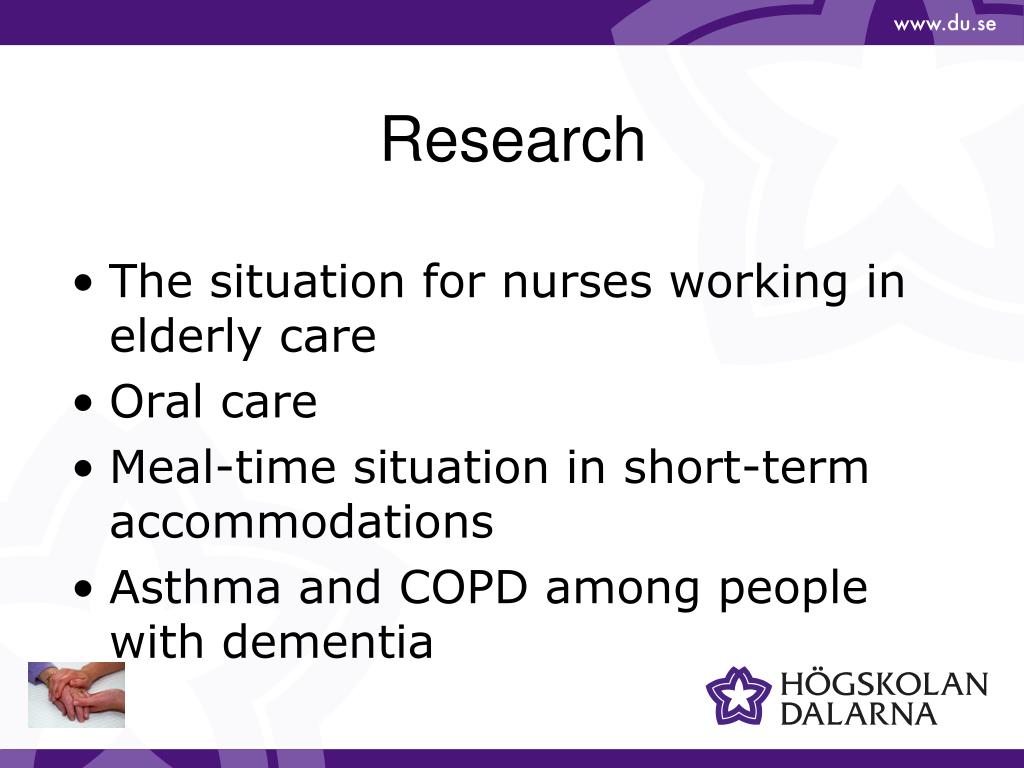 Research • The situation for nurses working in elderly care • Oral care • Meal-time situation in short-term accommodations • Asthma and COPD among people with dementia