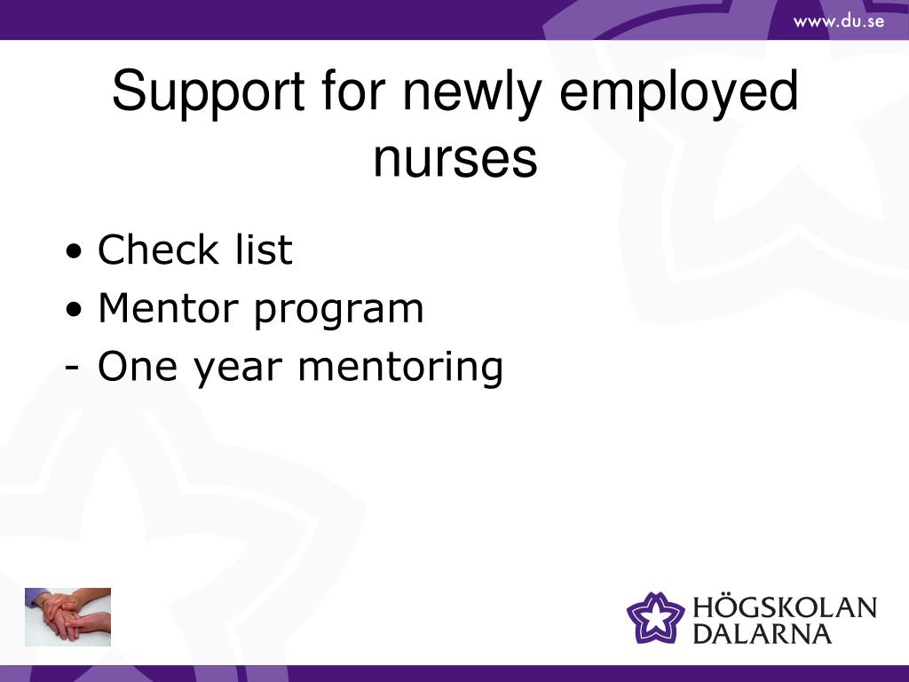 Support for newly employed nurses • Check list • Mentor program • Oneyearmentoring
