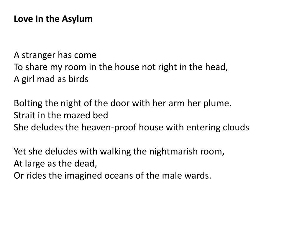 Love In the Asylum A stranger has come To share my room in the house not right in the head, A girl mad as birds Bolting the night of the door with her arm her plume. Strait in the mazed bed She deludes the heaven-proof house with entering clouds Yet she deludes with walking the nightmarish room, At large as the dead, Or rides the imagined oceans of the male wards.