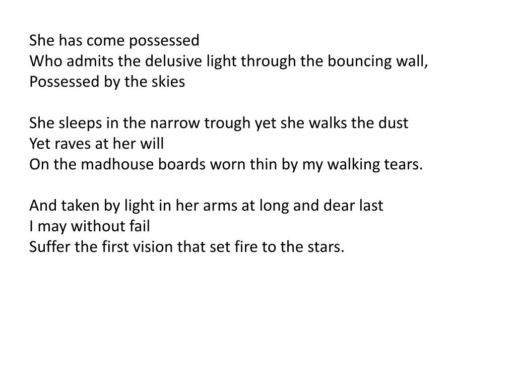 She has come possessed Who admits the delusive light through the bouncing wall, Possessed by the skies She sleeps in the narrow trough yet she walks the dust Yet raves at her will On the madhouse boards worn thin by my walking tears. And taken by light in her arms at long and dear last I may without fail Suffer the first vision that set fire to the stars.