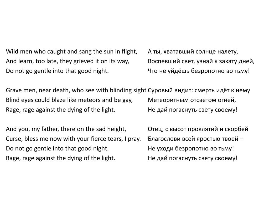 Wild men who caught and sang the sun in flight, And learn, too late, they grieved it on its way, Do not go gentle into that good night. Grave men, near death, who see with blinding sight Blind eyes could blaze like meteors and be gay, Rage, rage against the dying of the light. And you, my father, there on the sad height, Curse, bless me now with your fierce tears, I pray. Do not go gentle into that good night. Rage, rage against the dying of the light. А ты, хватавший солнце налету, Воспевший свет, узнай к закату дней, Что не уйдёшь безропотно во тьму! Суровый видит: смерть идёт к нему Метеоритным отсветом огней, Не дай погаснуть свету своему! Отец, с высот проклятий и скорбей Благослови всей яростью твоей – Не уходи безропотно во тьму! Не дай погаснуть свету своему!
