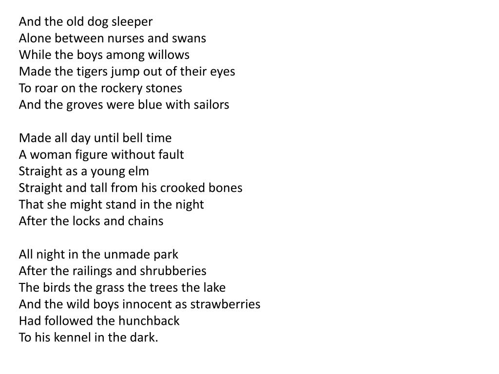 And the old dog sleeper Alone between nurses and swans While the boys among willows Made the tigers jump out of their eyes To roar on the rockery stones And the groves were blue with sailors Made all day until bell time A woman figure without fault Straight as a young elm Straight and tall from his crooked bones That she might stand in the night After the locks and chains All night in the unmade park After the railings and shrubberies The birds the grass the trees the lake And the wild boys innocent as strawberries Had followed the hunchback To his kennel in the dark.