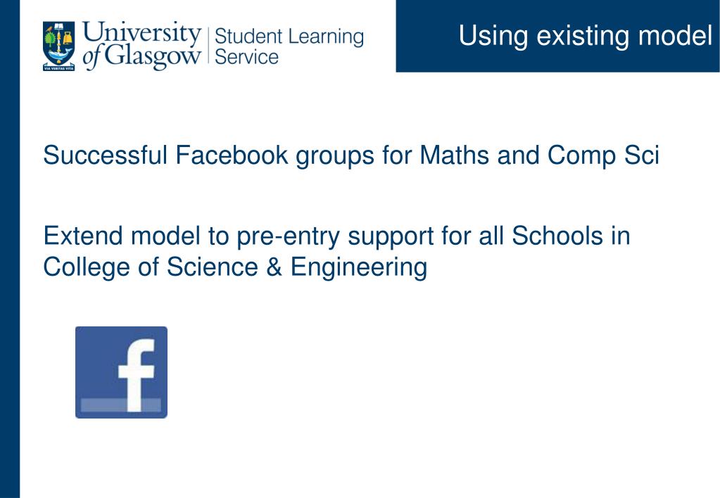 Using existing model • Successful Facebook groups for Maths and Comp Sci • Extend model to pre-entry support for all Schools in College of Science & Engineering