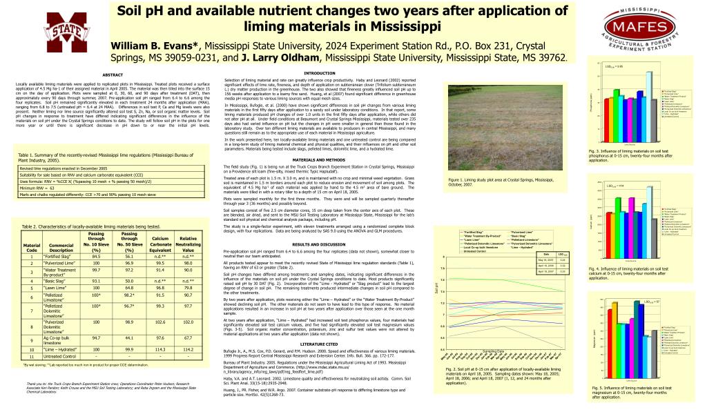 LSD0.05 = 57 LSD0.05 = 9.95 Magnesium (ppm) Phosphorus (ppm) Fig. 5. Influence of liming materials on soil test magnesium at 0-15 cm, twenty-four months after application. Fig. 3. Influence of liming materials on soil test phosphorus at 0-15 cm, twenty-four months after application. Soil pH and available nutrient changes two years after application of liming materials in Mississippi William B. Evans*, Mississippi State University, 2024 Experiment Station Rd., P.O. Box 231, Crystal Springs, MS 39059-0231, and J. Larry Oldham, Mississippi State University, Mississippi State, MS 39762. INTRODUCTION Selection of liming material and rate can greatly influence crop productivity. Haby and Leonard (2002) reported significant effects of lime rate, fineness, and depth of application on subterranean clover (Trifolium subterraneum L.) dry matter production in the greenhouse. The two also showed that fineness greatly influenced soil pH up to 156 weeks after application to a loamy fine sand. Huang, et al (2007) found significant difference in greenhouse media pH responses to various liming sources with equal mesh sizes. In Mississippi, Bufogle, et al. (2000) have shown significant differences in soil pH changes from various liming materials in the first fifty days after application to a sandy soil under laboratory conditions. In that report, some liming materials produced pH changes of over 1.0 units in the first fifty days after application, while others did not alter pH at all. Under field conditions at Beaumont and Crystal Springs Mississippi, materials tested over 235 days also had varied influence on pH but the changes in pH were smaller in general than those found in the laboratory study. Over ten different liming materials are available to producers in central Mississippi, and many questions still remain as to the appropriate use of each material in Mississippi agriculture. In the work presented here, ten locally-available liming materials and one untreated control are being compared in a long-term study of liming material chemical and physical qualities, and their influences on pH and other soil parameters. Materials being tested include slags, pelleted limes, dolomitic lime, and a hydrated lime. ABSTRACT Locally available liming materials were applied to replicated plots in Mississippi. Treated plots received a surface application of 4.5 Mg ha-1 of their assigned material in April 2005. The material was then tilled into the surface 15 cm on the day of application. Plots were sampled at 0, 30, 60, and 90 days after treatment (DAT), then approximately every 90 days through summer, 2007. Pre-application soil pH ranged from 6.4 to 6.6 among the four replicates. Soil pH remained significantly elevated in each treatment 24 months after application (MAA), ranging from 6.8 to 7.5 (untreated pH = 6.4 at 24 MAA). Differences in soil test P, Ca and Mg levels were also present. Neither liming nor lime source significantly altered soil test S, Zn, Na, or soil organic matter levels. Soil pH changes in response to treatment have differed indicating significant differences in the influence of the materials on soil pH under the Crystal Springs conditions to date. The study will follow soil pH in the plots for one more year or until there is significant decrease in pH down to or near the initial pH levels. Table 1. Summary of the recently-revised Mississippi lime regulations (Mississippi Bureau of Plant Industry, 2005). MATERIALS AND METHODS The field study (Fig. 1) is being run at the Truck Crops Branch Experiment Station in Crystal Springs, Mississippi on a Providence silt loam (fine-silty, mixed thermic Typic Hapludalf). Treated area of each plot is 1.5 m. X 3.0 m, and is maintained with no crop and minimal weed vegetation. Grass sod is maintained in 1.5 m borders around each plot to reduce erosion and movement of soil among plots. The equivalent of 4.5 Mg ha-1 of each material was applied by hand to the 4.5 m2 area of bare ground. The materials were tilled in with a rotary tiller to a depth of 15 cm on April 18, 2005. Plots were sampled monthly for the first three months. They were and will be sampled quarterly thereafter through year 3 (36 months) and possibly beyond. Soil samples consist of five 2.5 cm diameter cores, 15 cm deep taken from the center axis of each plot. These are blended, air dried, and sent to the MSU Soil Testing Laboratory at Mississippi State, Mississippi for the lab’s standard soil physical and chemical analysis package, including pH. The study is a single-factor experiment, with eleven treatments arranged using a randomized complete block design, with four replications. Data are being analyzed by SAS 9.0 using the ANOVA and GLM procedures. RESULTS AND DISCUSSION Pre-application soil pH ranged from 6.4 to 6.6 among the four replicates (data not shown), somewhat closer to neutral than our team anticipated. All products tested appear to meet the recently revised State of Mississippi lime regulation standards (Table 1), having an RNV of 63 or greater (Table 2). Soil pH changes have differed among treatments and sampling dates, indicating significant differences in the influence of the materials on soil pH under the Crystal Springs conditions to date. Most products significantly raised soil pH by 30 DAT (Fig. 2). Incorporation of the “Lime - Hydrated” or “Slag product” lead to the largest degree of change in soil pH. The remaining treatments produced intermediate changes in soil pH compared to the other treatments. By two years after application, plots receiving either the “Lime – Hydrated” or the “Water Treatment By-Product” showed declining soil pH. The other materials do not seem to have lead to this type of response. No material applications resulted in an increase in soil pH at two years after application over those seen at the one month sample. At two years after application, “Lime – Hydrated” had increased soil test phosphorus values, four materials had s