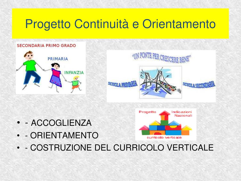- ACCOGLIENZA - ORIENTAMENTO - COSTRUZIONE DEL CURRICOLO VERTICALE Progetto Continuità e Orientamento