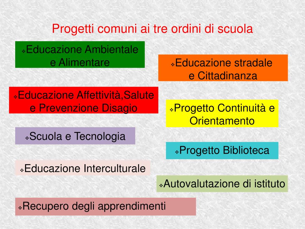 Progetti comuni ai tre ordini di scuola • Educazione Ambientale e Alimentare • Educazione stradale e Cittadinanza • Educazione Affettività,Salute e Prevenzione Disagio • Progetto Continuità e Orientamento • Scuola e Tecnologia • Progetto Biblioteca • Educazione Interculturale • Autovalutazione di istituto • Recupero degli apprendimenti