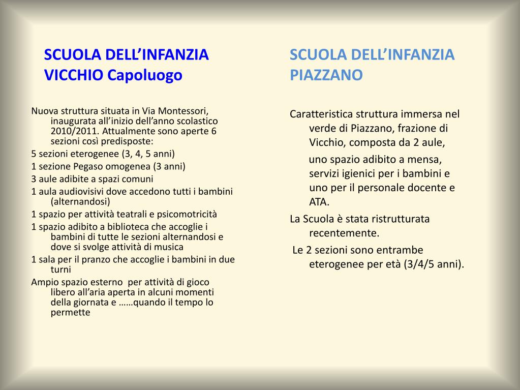 SCUOLA DELL’INFANZIA VICCHIO Capoluogo SCUOLA DELL’INFANZIA PIAZZANO Nuova struttura situata in Via Montessori, inaugurata all’inizio dell’anno scolastico 2010/2011. Attualmente sono aperte 6 sezioni così predisposte: 5 sezioni eterogenee (3, 4, 5 anni) 1 sezione Pegaso omogenea (3 anni) 3 aule adibite a spazi comuni 1 aula audiovisivi dove accedono tutti i bambini (alternandosi) 1 spazio per attività teatrali e psicomotricità 1 spazio adibito a biblioteca che accoglie i bambini di tutte le sezioni alternandosi e dove si svolge attività di musica 1 sala per il pranzo che accoglie i bambini in due turni Ampio spazio esterno per attività di gioco libero all’aria aperta in alcuni momenti della giornata e ……quando il tempo lo permette Caratteristica struttura immersa nel verde di Piazzano, frazione di Vicchio, composta da 2 aule, uno spazio adibito a mensa, servizi igienici per i bambini e uno per il personale docente e ATA. La Scuola è stata ristrutturata recentemente. Le 2 sezioni sono entrambe eterogenee per età (3/4/5 anni).