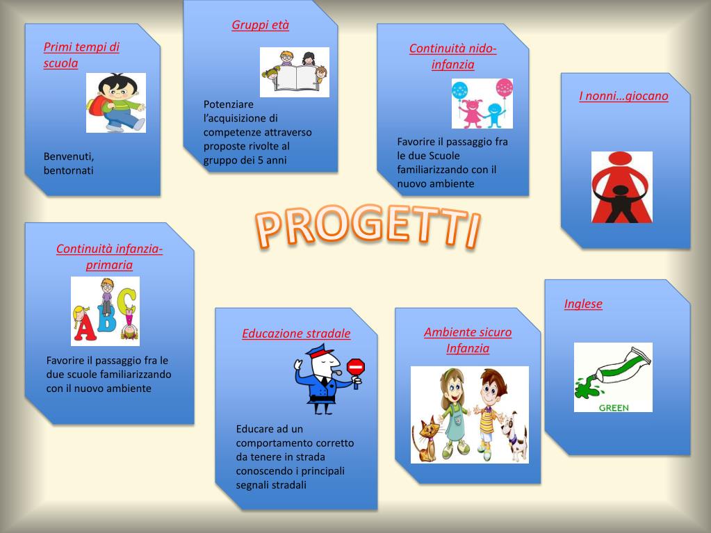 Gruppi età Potenziare l’acquisizione di competenze attraverso proposte rivolte al gruppo dei 5 anni Primi tempi di scuola Benvenuti, bentornati Continuità nido-infanzia Favorire il passaggio fra le due Scuole familiarizzando con il nuovo ambiente I nonni…giocano Continuità infanzia-primaria Favorire il passaggio fra le due scuole familiarizzando con il nuovo ambiente PROGETTI Inglese Educazione stradale Educare ad un comportamento corretto da tenere in strada conoscendo i principali segnali stradali Ambiente sicuro Infanzia