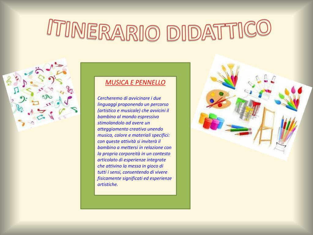 ITINERARIO DIDATTICO MUSICA E PENNELLO Cercheremo di avvicinare i due linguaggi proponendo un percorso (artistico e musicale) che avvicini il bambino al mondo espressivo stimolandolo ad avere un atteggiamento creativo unendo musica, colore e materiali specifici: con queste attività si inviterà il bambino a mettersi in relazione con la propria corporeità in un contesto articolato di esperienze integrate che attivino la messa in gioco di tutti i sensi, consentendo di vivere fisicamente significati ed esperienze artistiche.