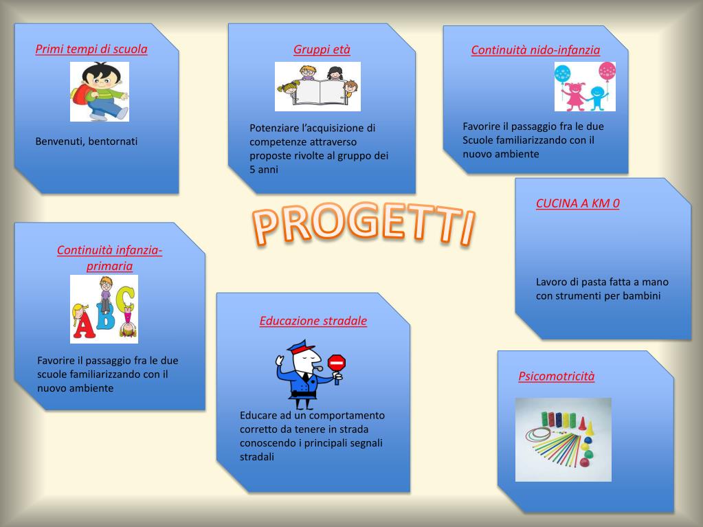 Primi tempi di scuola Benvenuti, bentornati Gruppi età Potenziare l’acquisizione di competenze attraverso proposte rivolte al gruppo dei 5 anni Continuità nido-infanzia Favorire il passaggio fra le due Scuole familiarizzando con il nuovo ambiente CUCINA A KM 0 Lavoro di pasta fatta a mano con strumenti per bambini Continuità infanzia-primaria Favorire il passaggio fra le due scuole familiarizzando con il nuovo ambiente PROGETTI Educazione stradale Educare ad un comportamento corretto da tenere in strada conoscendo i principali segnali stradali Psicomotricità