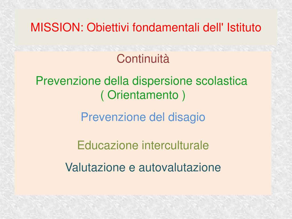 MISSION: Obiettivi fondamentali dell' Istituto Continuità Prevenzione della dispersione scolastica ( Orientamento ) Prevenzione del disagio Educazione interculturale Valutazione e autovalutazione