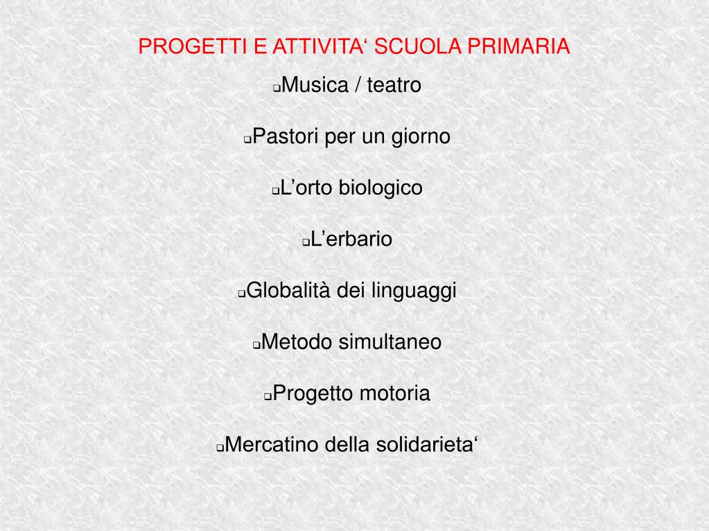 PROGETTI E ATTIVITA‘SCUOLA PRIMARIA • Musica / teatro • Pastori per un giorno • L’orto biologico • L’erbario • Globalità dei linguaggi • Metodo simultaneo • Progetto motoria • Mercatino della solidarieta‘