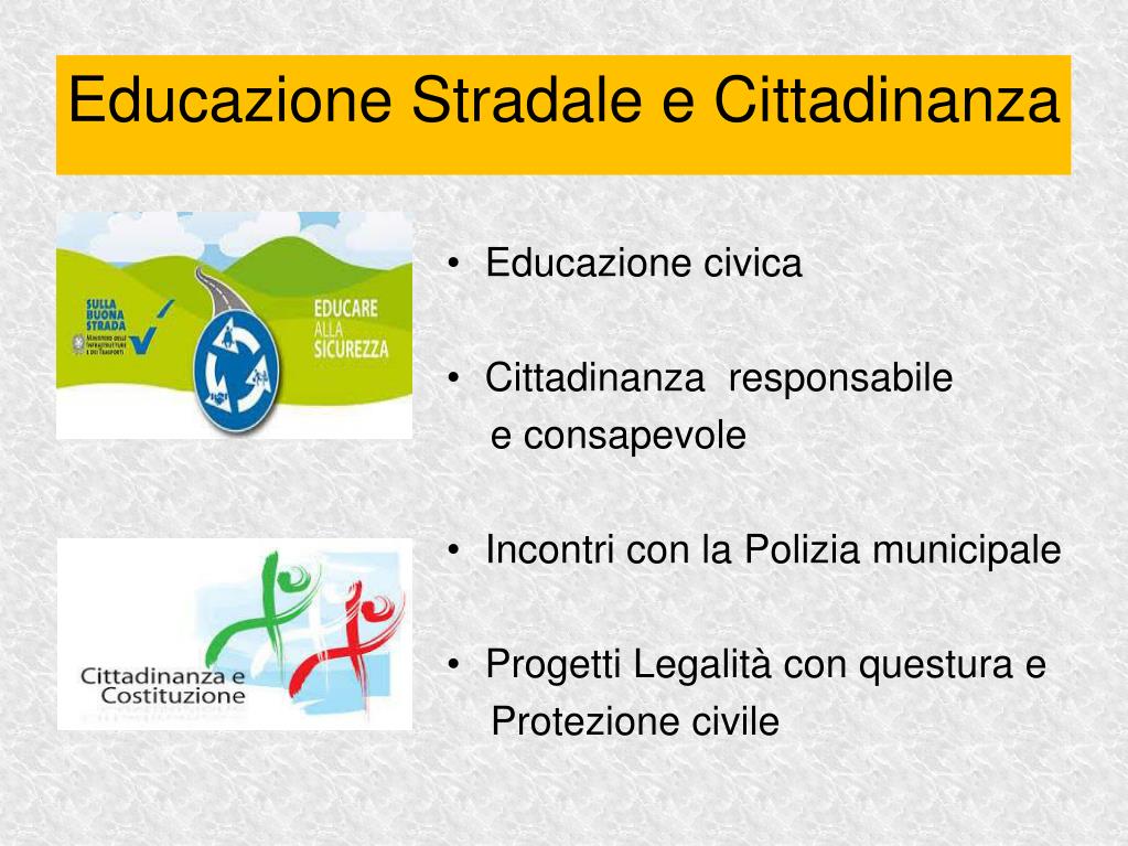 Educazione civica Cittadinanza responsabile e consapevole Incontri con la Polizia municipale Progetti Legalità con questura e Protezione civile Educazione Stradale e Cittadinanza