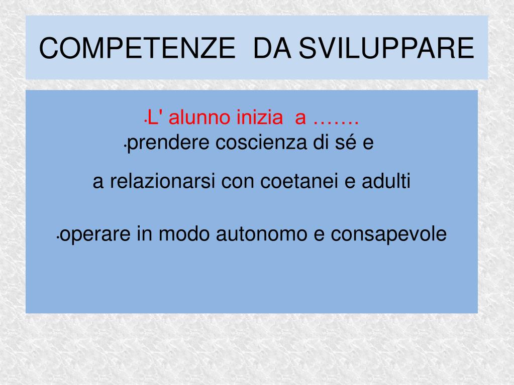COMPETENZE DA SVILUPPARE • L' alunno inizia a ……. • prendere coscienza di sé e • a relazionarsi con coetanei e adulti • operare in modo autonomo e consapevole