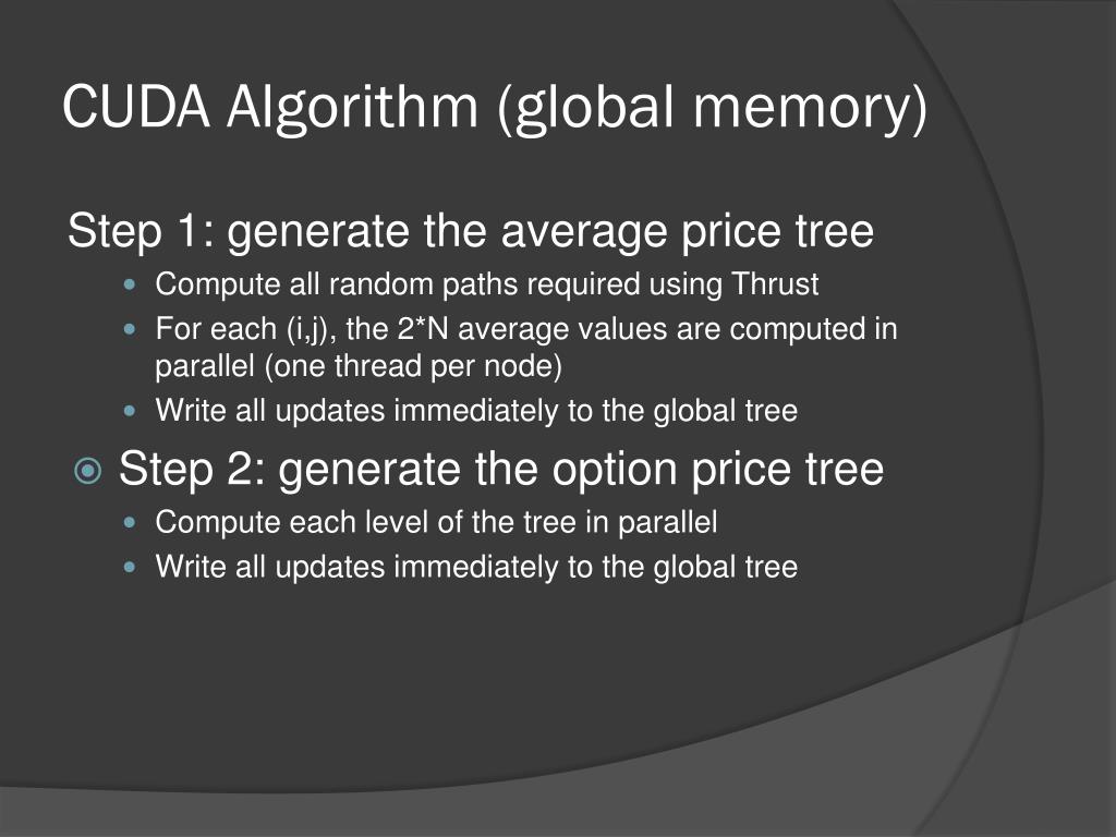 CUDA Algorithm (global memory) Step 1: generate the average price tree • Compute all random paths required using Thrust • For each (i,j), the 2*N average values are computed in parallel (one thread per node) • Write all updates immediately to the global tree • Step 2: generate the option price tree • Compute each level of the tree in parallel • Write all updates immediately to the global tree