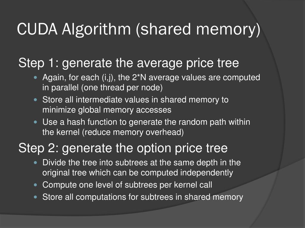 CUDA Algorithm (shared memory) Step 1: generate the average price tree • Again, for each (i,j), the 2*N average values are computed in parallel (one thread per node) • Store all intermediate values in shared memory to minimize global memory accesses • Use a hash function to generate the random path within the kernel (reduce memory overhead) Step 2: generate the option price tree • Divide the tree into subtreesat the same depth in the original tree which can be computed independently • Compute one level of subtrees per kernel call • Store all computations for subtrees in shared memory