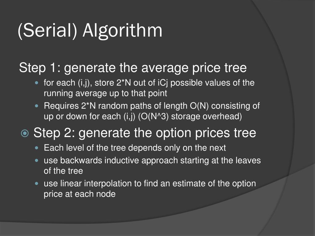 (Serial) Algorithm Step 1: generate the average price tree • for each (i,j), store 2*N out of iCj possible values of the running average up to that point • Requires 2*N random paths of length O(N) consisting of up or down for each (i,j) (O(N^3) storage overhead) • Step 2: generate the option prices tree • Each level of the tree depends only on the next • use backwards inductive approach starting at the leaves of the tree • use linear interpolation to find an estimate of the option price at each node