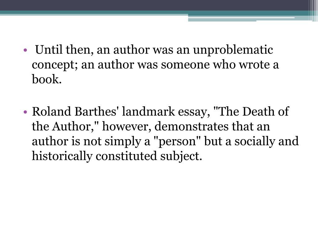 Until then, an author was an unproblematic concept; an author was someone who wrote a book. • Roland Barthes' landmark essay, "The Death of the Author," however, demonstrates that an author is not simply a "person" but a socially and historically constituted subject.