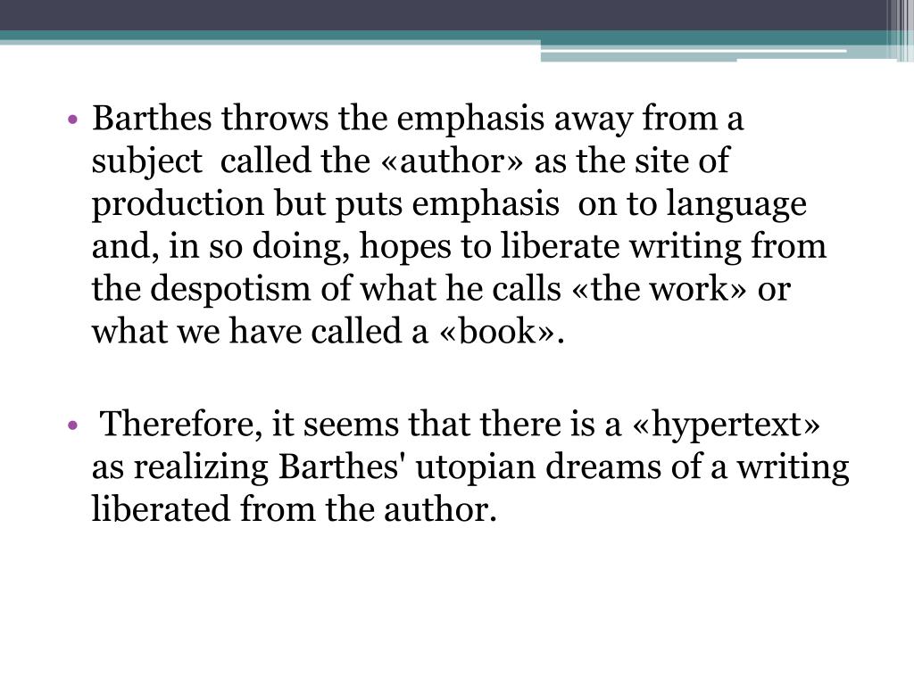 Barthes throws the emphasis away from a subject called the «author» as the site of production but puts emphasis on to language and, in so doing, hopes to liberate writing from the despotism of what he calls «the work»or what we have called a «book». • Therefore, it seems that there is a «hypertext»as realizing Barthes' utopian dreams of a writing liberated from the author.