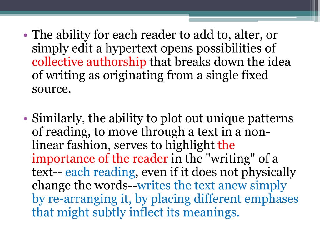 The ability for each reader to add to, alter, or simply edit a hypertext opens possibilities of collective authorship that breaks down the idea of writing as originating from a single fixed source. • Similarly, the ability to plot out unique patterns of reading, to move through a text in anon-linear fashion, serves to highlight the importance of the reader in the "writing" of a text--each reading, even if it does not physically change the words--writes the text anew simply by re-arranging it, by placing different emphases that might subtly inflect its meanings.