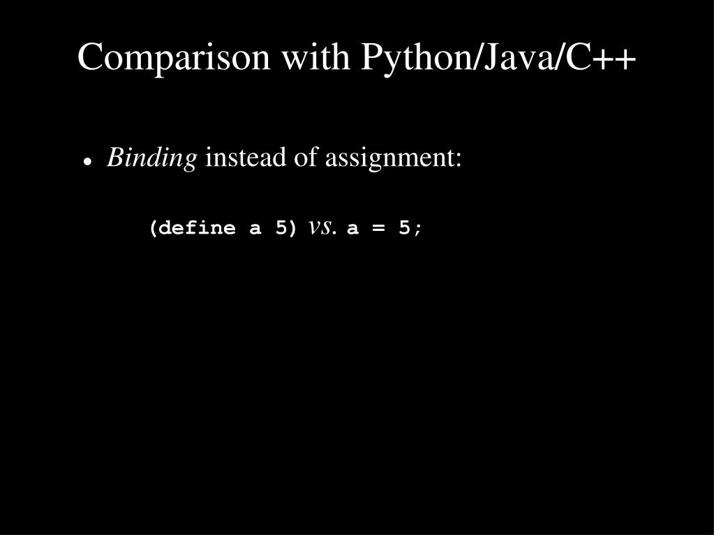 Comparison with Python/Java/C++ • Binding instead of assignment: • (define a 5)vs.a = 5;