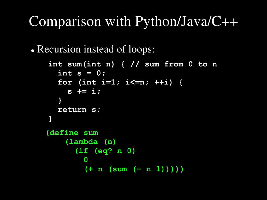 Comparison with Python/Java/C++ • Recursion instead of loops: int sum(int n) { // sum from 0 to n int s = 0; for (int i=1; i<=n; ++i) { s += i; } return s; } (define sum (lambda (n) (if (eq? n 0) 0 (+ n (sum (- n 1)))))