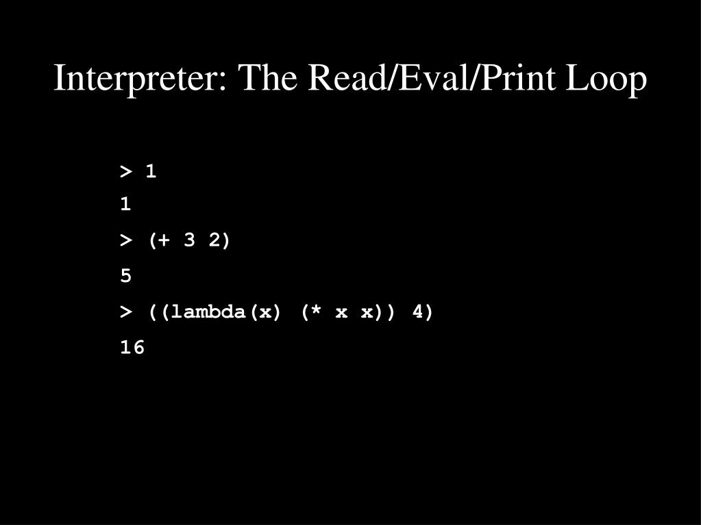 Interpreter: The Read/Eval/Print Loop > 1 1 > (+ 3 2) 5 > ((lambda(x) (* x x)) 4) 16