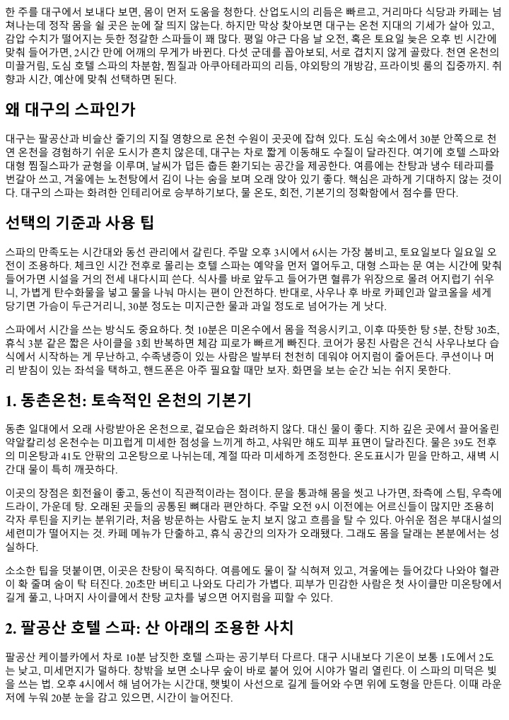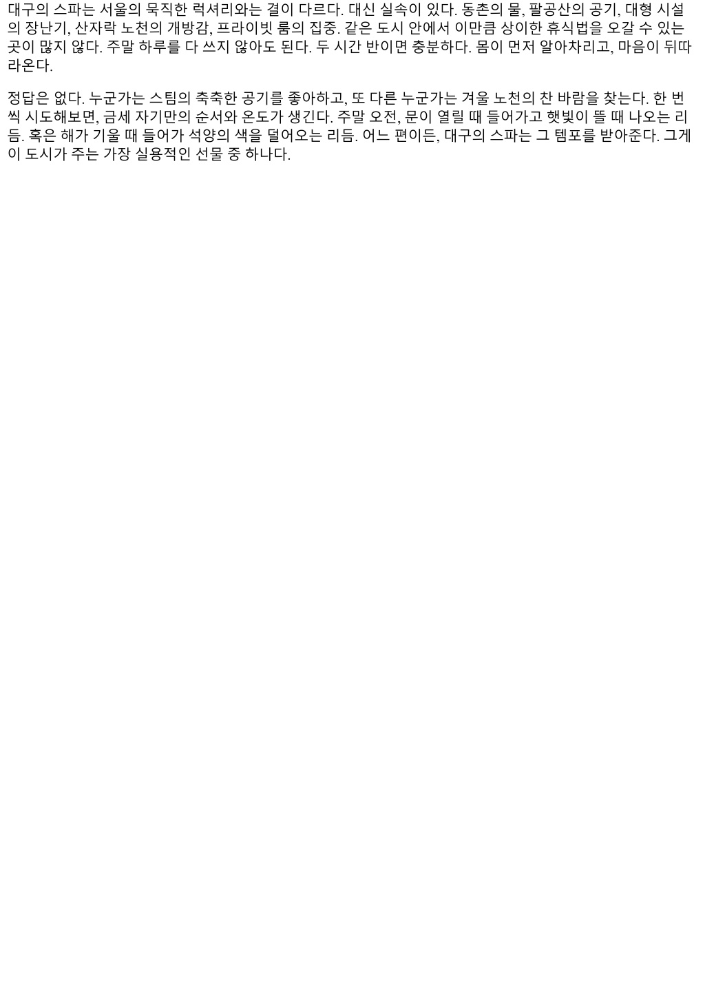 대구의스파는서울의묵직한럭셔리와는결이다르다. 대신실속이있다. 동촌의물, 팔공산의공기, 대형시설 의장난기, 산자락노천의개방감, 프라이빗룸의집중. 같은도시안에서이만큼상이한휴식법을오갈수있는 곳이많지않다. 주말하루를다쓰지않아도된다. 두시간반이면충분하다. 몸이먼저알아차리고, 마음이뒤따 라온다. 정답은없다. 누군가는스팀의축축한공기를좋아하고, 또다른누군가는겨울노천의찬바람을찾는다. 한번 씩시도해보면, 금세자기만의순서와온도가생긴다. 주말오전, 문이열릴때들어가고햇빛이뜰때나오는리 듬. 혹은해가기울때들어가석양의색을덜어오는리듬. 어느편이든, 대구의스파는그템포를받아준다. 그게 이도시가주는가장실용적인선물중하나다.