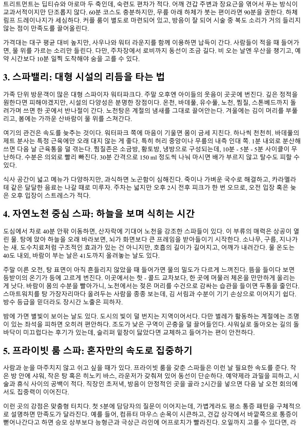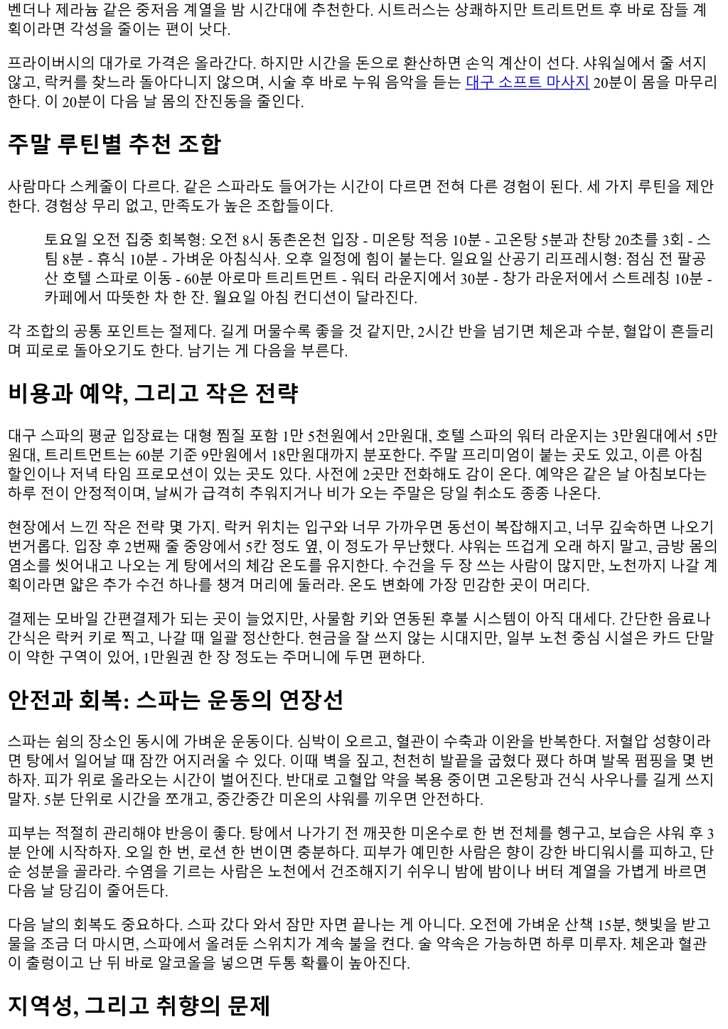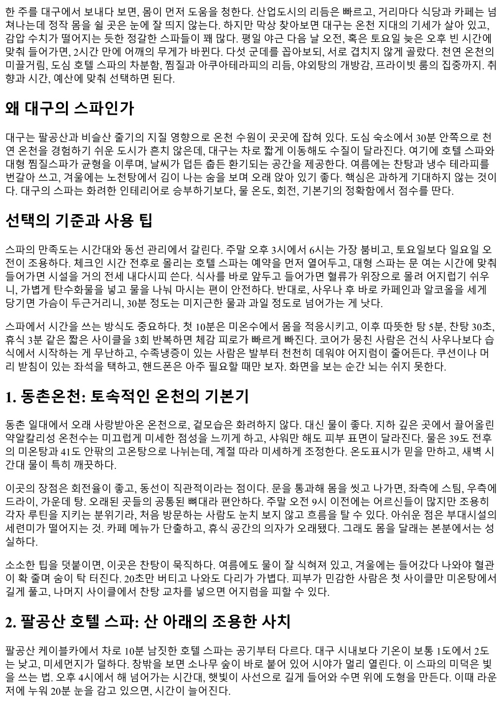 트리트먼트는딥티슈와아로마두축인데, 숙련도편차가적다. 어깨견갑주변과장요근을엮어서푸는방식이 교과서적이지만단조롭지않다. 60분코스도충분하지만, 무릎아래하체가붓는편이라면 90분을권한다. 하체 림프드레이나지가세심하다. 커플룸이별도로마련되어있고, 방음이잘되어시술중복도소리가거의들리지 않는점이만족도를끌어올린다. 가격대는대구평균대비높지만, 사우나와워터라운지를함께이용하면납득이간다. 사람들이적을때들어가 면, 물위를가르는소리만들린다. 다만, 주차장에서로비까지동선이조금길다. 비오는날엔우산을챙기고, 예 약시간보다 10분일찍도착해야숨을고를수있다. 3. 스파밸리: 대형시설의리듬을타는법 가족단위방문객이많은대형스파이자워터파크다. 주말오후엔아이들의웃음이곳곳에번진다. 깊은정적을 원한다면피해야겠지만, 시설의다양성은분명한장점이다. 온천, 바데풀, 유수풀, 노천, 찜질, 스톤베드까지돌 려가며쓰면한곳에서반나절이간다. 노천탕은계절의냄새를그대로끌어안는다. 겨울에는김이머리를부풀 리고, 봄에는가까운산바람이물위를스쳐간다. 여기의관건은속도를늦추는것이다. 워터파크쪽에마음이기울면몸이금세지친다. 하나씩천천히. 바데풀의 제트분사는특정근육에만오래대지않는게좋다. 특히허리중앙이나무릎의내측인대쪽. 1분내외로분산해 쓰면다음날근육통을덜겪는다. 찜질존은소금방, 황토방, 냉방으로구성되는데, 10분 - 5분 - 5분사이클이무 난하다. 수분은의외로빨리빠진다. 30분간격으로 150 ml 정도씩나눠마시면배가부르지않고탈수도피할수 있다. 식사공간이넓고메뉴가다양하지만, 과식하면노곤함이심해진다. 죽이나가벼운국수로해결하고, 카라멜라 테같은달달한음료는나갈때로미루자. 주차는넓지만오후 2시전후피크가한번오므로, 오전입장혹은늦 은오후입장이스트레스가적다. 4. 자연노천중심스파: 하늘을보며식히는시간 도심에서차로 40분안팎이동하면, 산자락에기대어노천을강조한스파들이있다. 이부류의매력은상공이열 린물. 탕에앉아하늘을오래바라보면, 뇌가화면보다큰프레임을받아들이기시작한다. 소나무, 구름, 지나가 는새. 도수치료처럼구조적인효과가있는건아니지만, 호흡의길이가길어지고, 어깨가내려간다. 물온도는 40도내외, 바람이부는날은 41도까지올려놓는날도있다. 주말이른오전, 탕표면이아직흔들리지않았을때들어가면물의밀도가다르게느껴진다. 뜸을들이다보면 등받이의온기가등에고르게번진다. 이곳에서는핫 - 콜드교차보다, 한곳에머물러체온을만만하게올리는 게낫다. 바람이몸의수분을빨아가니, 노천에서는젖은머리를수건으로감싸는습관을들이면두통을줄인다. 스마트워치를탕가장자리마다올려두는사람을종종보는데, 김서림과수분이기기손상으로이어지기쉽다. 방수등급을믿더라도장시간노출은피하자. 밤에가면별빛이보이는날도있다. 도시의빛이덜번지는지역이어서다. 다만벌레가활동하는계절에는조명 이있는좌석을피하면오히려편안하다. 조도가낮은구역이곤충을덜끌어들인다. 샤워실로돌아오는길의돌 바닥이미끄럽다는후기가있는데, 슬리퍼밑창이닳았다면교체하고들어가는편이안전하다. 5. 프라이빗룸스파: 혼자만의속도로집중하기 사람과눈을마주치지않고쉬고싶을때가있다. 프라이빗룸을갖춘스파들은이런날필요한속도를준다. 작 은방안에샤워, 작은탕혹은히노키바스, 라운저가갖춰져있어동선이단순하다. 예약제라과밀을피하고, 시 술과휴식사이의공백이적다. 직장인초저녁, 방음이안정적인곳을골라 2시간을넣으면다음날오전회의에 서도집중력이이어진다. 이런곳의강점은맞춤형터치다. 첫 5분에담당자의질문이이어지는데, 가볍게라도평소통증패턴을구체적으 로설명하면만족도가달라진다. 예를들어, 컴퓨터마우스손목이시큰하고, 견갑상각에서바깥쪽으로통증이 뻗어나간다고하면승모상부보다능형근과극상근라인에어프로치가빨라진다. 오일까지고를수있다면, 라