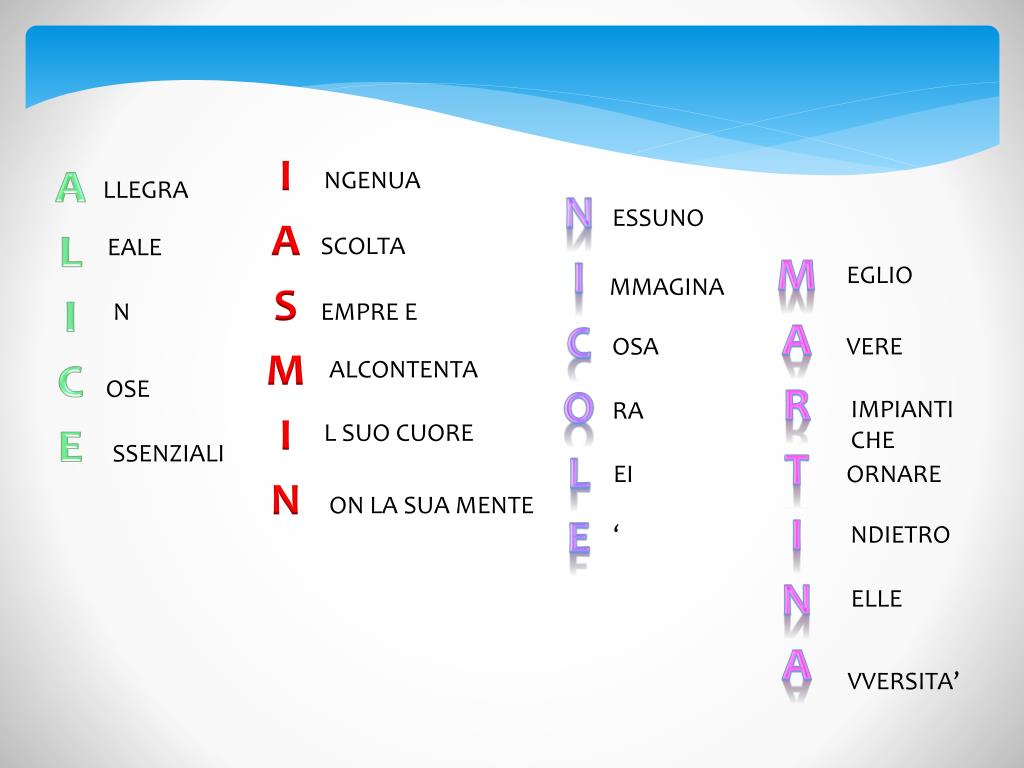 Acrostici dei ragazzi della 2^e. NIC OLE. ALICE. IASMIN. NGENUA. LLEGRA. ESSUNO. MARTINA. SCOLTA. EALE. EGLIO. MMAGINA. N. EMPRE E. OSA. VERE. ALCONTENTA. OSE. IMPIANTI CHE. RA. L SUO CUORE. SSENZIALI. EI. ORNARE. ON LA SUA MENTE. ‘. NDIETRO. ELLE. VVERSITA’. JASMINE.