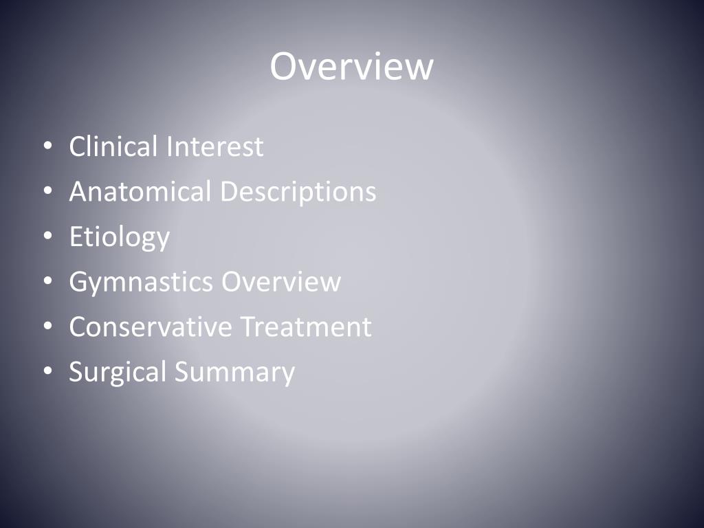 Overview • Clinical Interest • Anatomical Descriptions • Etiology • Gymnastics Overview • Conservative Treatment • Surgical Summary