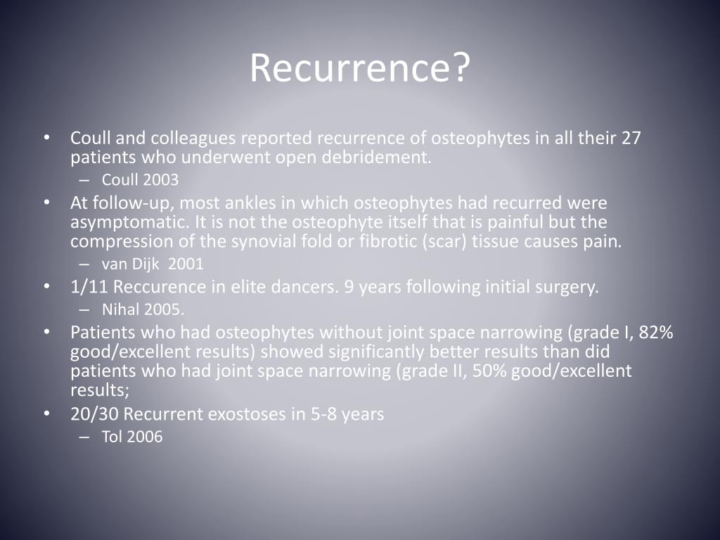 Recurrence? • Coull and colleagues reported recurrence of osteophytes in all their 27 patients who underwent open debridement. • Coull 2003 • At follow-up, most ankles in which osteophytes had recurred were asymptomatic. It is not the osteophyte itself that is painful but the compression of the synovial fold or fibrotic (scar) tissue causes pain. • van Dijk 2001 • 1/11 Reccurence in elite dancers. 9 years following initial surgery. • Nihal2005. • Patients who had osteophytes without joint space narrowing (grade I, 82% good/excellent results) showed significantly better results than did patients who had joint space narrowing (grade II, 50% good/excellent results; • 20/30 Recurrent exostoses in 5-8 years • Tol2006