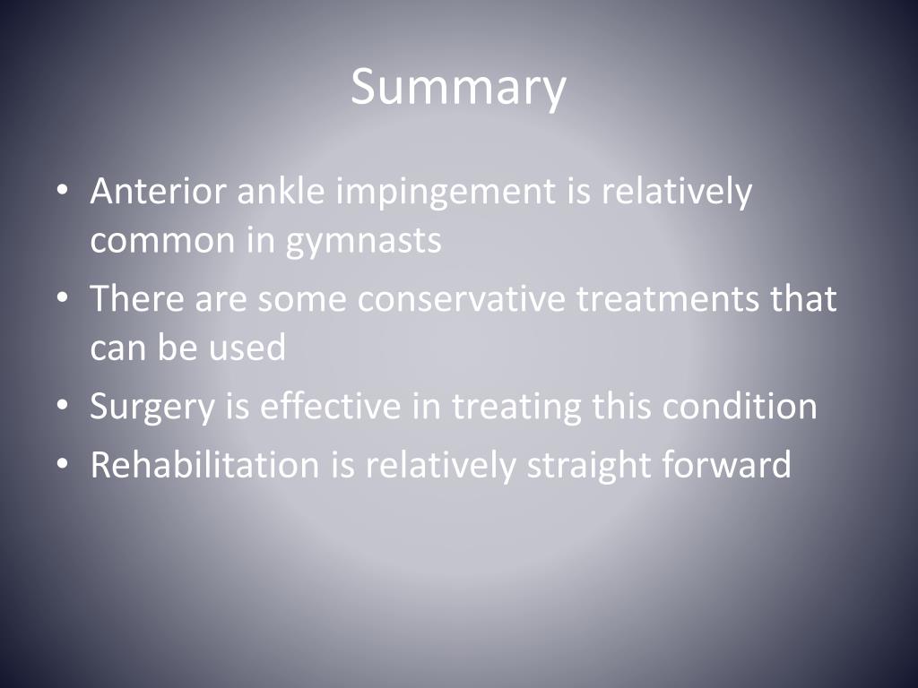 Summary • Anterior ankle impingement is relatively common in gymnasts • There are some conservative treatments that can be used • Surgery is effective in treating this condition • Rehabilitation is relatively straight forward