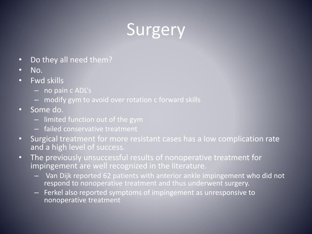 Surgery • Do they all need them? • No. • Fwd skills • no pain cADL’s • modify gym to avoid over rotation c forward skills • Some do. • limited function out of the gym • failed conservative treatment • Surgical treatment for more resistant cases has a low complication rate and a high level of success. • The previously unsuccessful results of nonoperative treatment for impingement are well recognized in the literature. • Van Dijk reported 62 patients with anterior ankle impingement who did not respond to nonoperative treatment and thus underwent surgery. • Ferkel also reported symptoms of impingement as unresponsive to nonoperativetreatment