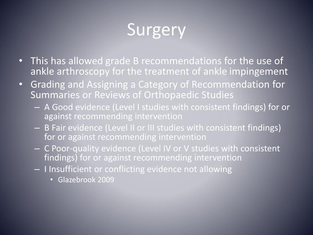 Surgery • This has allowed grade B recommendations for the use of ankle arthroscopy for the treatment of ankle impingement • Grading and Assigning a Category of Recommendation for Summaries or Reviews of Orthopaedic Studies • A Good evidence (Level I studies with consistent findings) for or against recommending intervention • B Fair evidence (Level II or III studies with consistent findings) for or against recommending intervention • C Poor-quality evidence (Level IV or V studies with consistent findings) for or against recommending intervention • I Insufficient or conflicting evidence not allowing • Glazebrook 2009