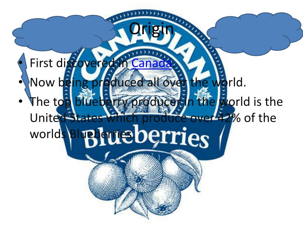 Origin • First discovered in Canada. • Now being produced all over the world. • The top blueberry producer in the world is the United States which produce over 42% of the worlds Blueberries.