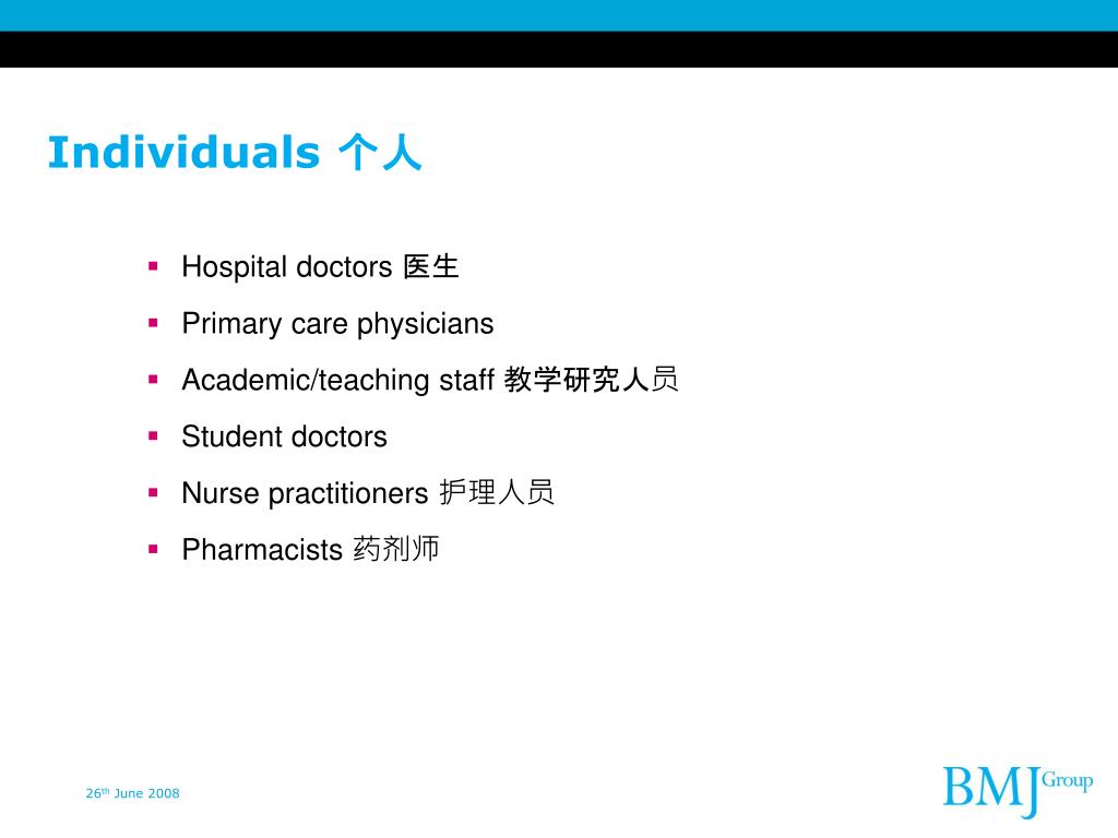 Individuals个人 Hospital doctors医生 Primary care physicians Academic/teaching staff教学研究人员 Student doctors Nurse practitioners护理人员 Pharmacists药剂师