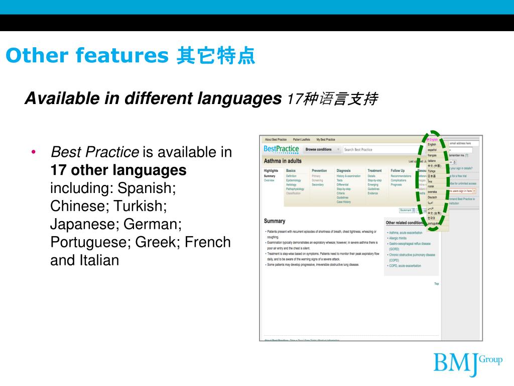 Other features其它特点 Available in different languages17种语言支持 • Best Practice is available in 17other languages including: Spanish; Chinese; Turkish; Japanese; German; Portuguese; Greek; French and Italian