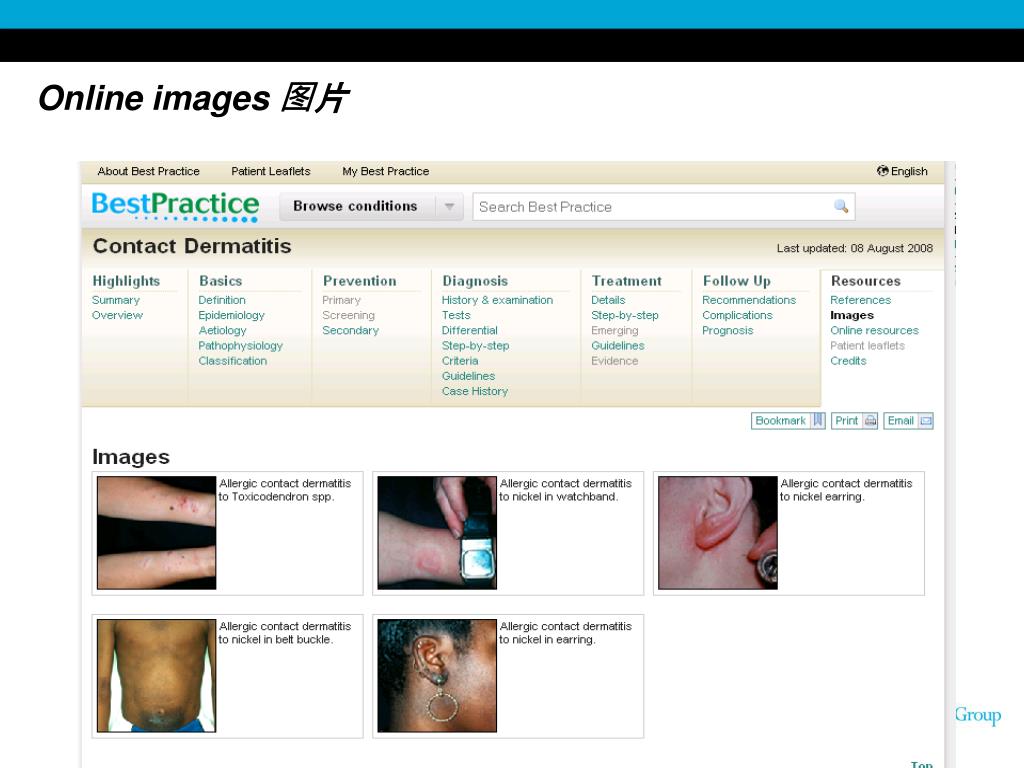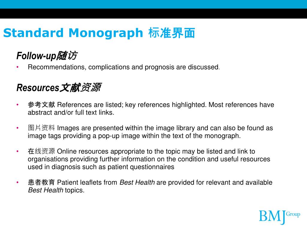 Follow-up随访 Recommendations, complications and prognosis are discussed. Resources文献资源 参考文献 References are listed; key references highlighted. Most references have abstract and/or full text links. 图片资料 Images are presented within the image library and can also be found as image tags providing a pop-up image within the text of the monograph. 在线资源 Online resources appropriate to the topic may be listed and link to organisations providing further information on the condition and useful resources used in diagnosis such as patient questionnaires 患者教育 Patient leaflets from Best Health are provided for relevant and available Best Health topics. Standard Monograph标准界面