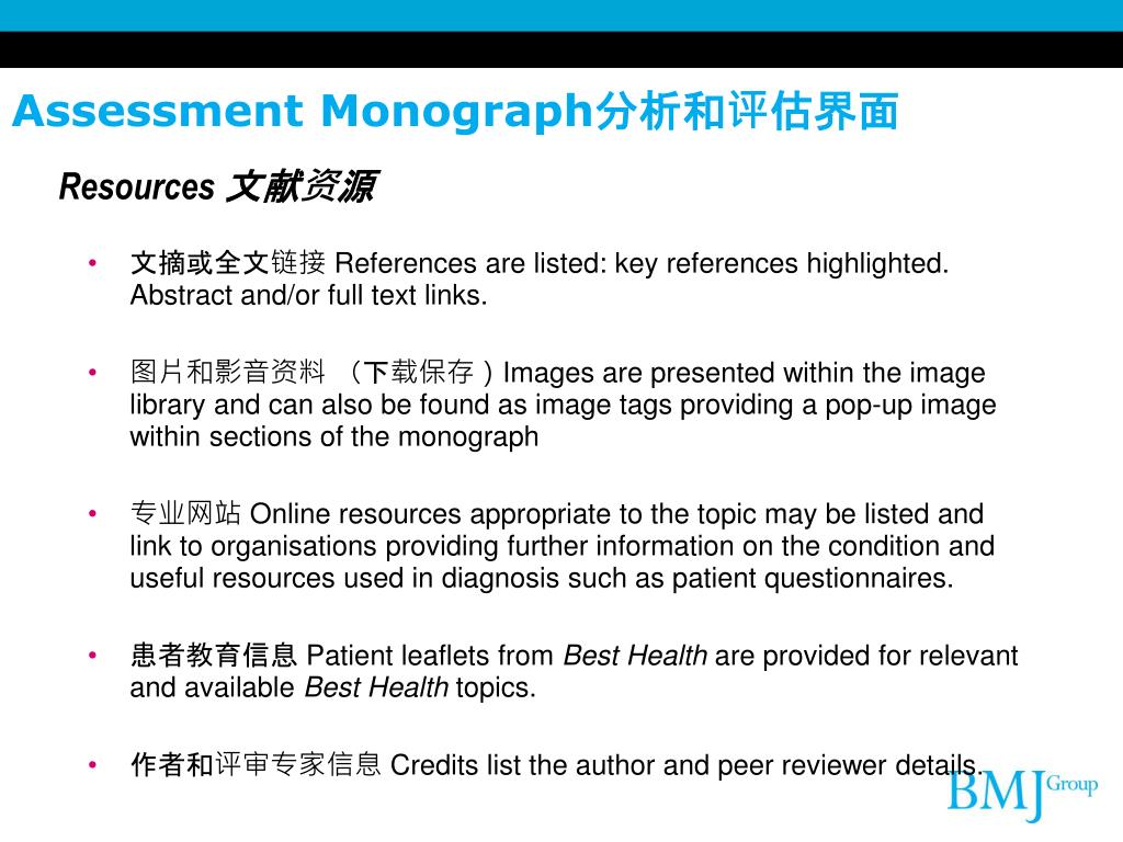 文摘或全文链接 References are listed: key references highlighted. Abstract and/or full text links. 图片和影音资料 (下载保存)Images are presented within the image library and can also be found as image tags providing a pop-up image within sections of the monograph 专业网站 Online resources appropriate to the topic may be listed and link to organisations providing further information on the condition and useful resources used in diagnosis such as patient questionnaires. 患者教育信息 Patient leaflets from Best Health are provided for relevant and available Best Health topics. 作者和评审专家信息 Credits list the author and peer reviewer details. Assessment Monograph分析和评估界面 Resources文献资源