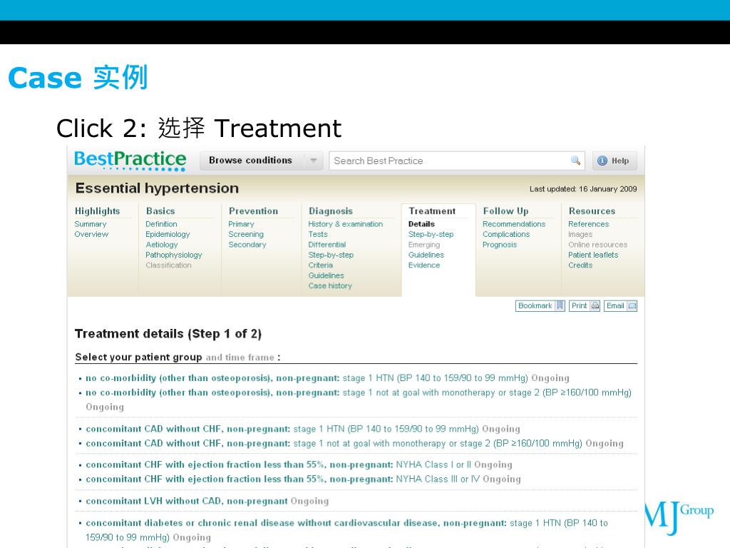 Best Practice from the BMJ Evidence Centre is a new, comprehensive online decision-support tool designed to be used at the point of care. Best Practice Highlights 要点 • 一万多种诊断方法 • 金标准同行评审 • 完全整合“临床证据” • 实时更新 ; • 每一疾病提供标准结构内容:总结,预防,诊断(诊断步骤,鉴别诊断,指南),治疗(方法,证据,指南), 随访,参考图片影音资料;