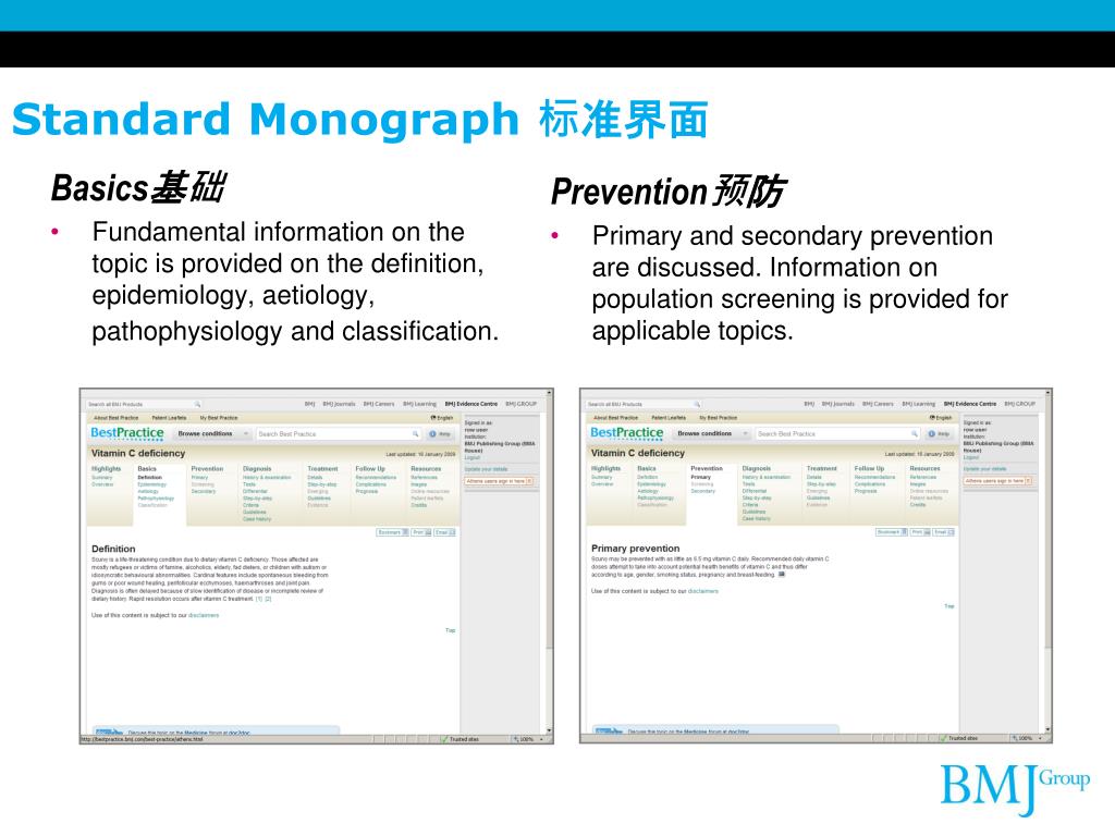 Standard Monograph标准界面 Comprehensive information on a specific condition or group of conditions. 显示单个或多个病症的综合信息 It covers all aspects of the disease including: basic information, prevention, diagnosis, follow up-recommendations and resources A standard monograph for Vitamin C deficiency